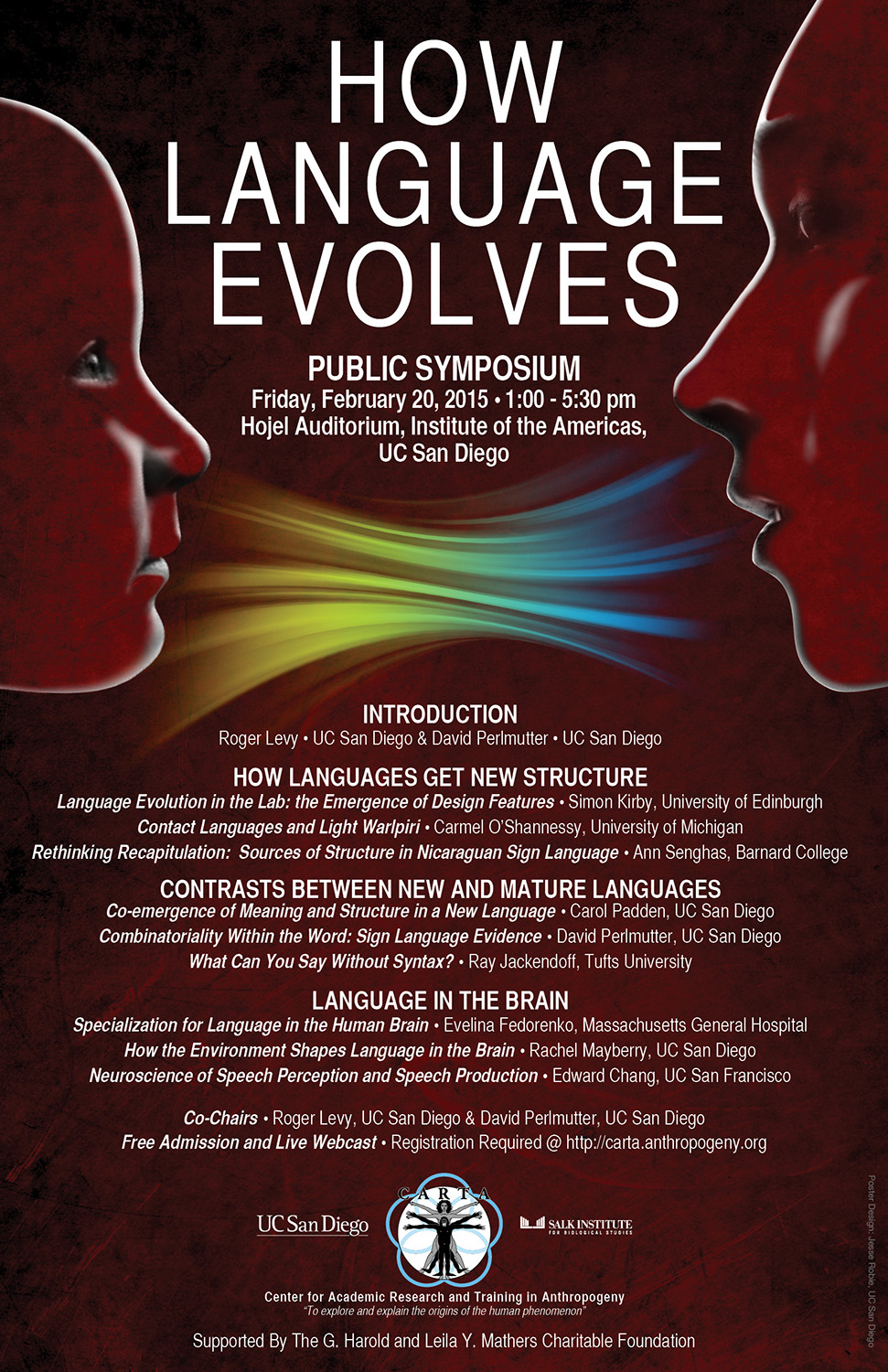 CARTA (Center for Academic Research & Training in Anthropogeny) are webcasting their free symposium on “How Language Evolves” on Friday, February 20th (1:00 – 5:30 pm PST), co-chaired by Roger Levy (UC San Diego) and David Perlmutter (UC San Diego).